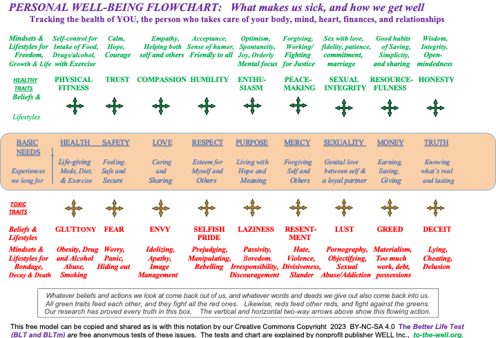 DEFINING HEALTHY Our modern concept of quick symptom relief doesn’t get to the root of sickness. Instead, our free, anonymous online test (the Better Life Test - mini, the BLTm) defines what’s healthy as whatever does the most good and the least harm for the most people in the long run. Seeing healthy this way is practical, reminding us that health and sickness are both contagious, as we take in what we put out, and vice-versa.